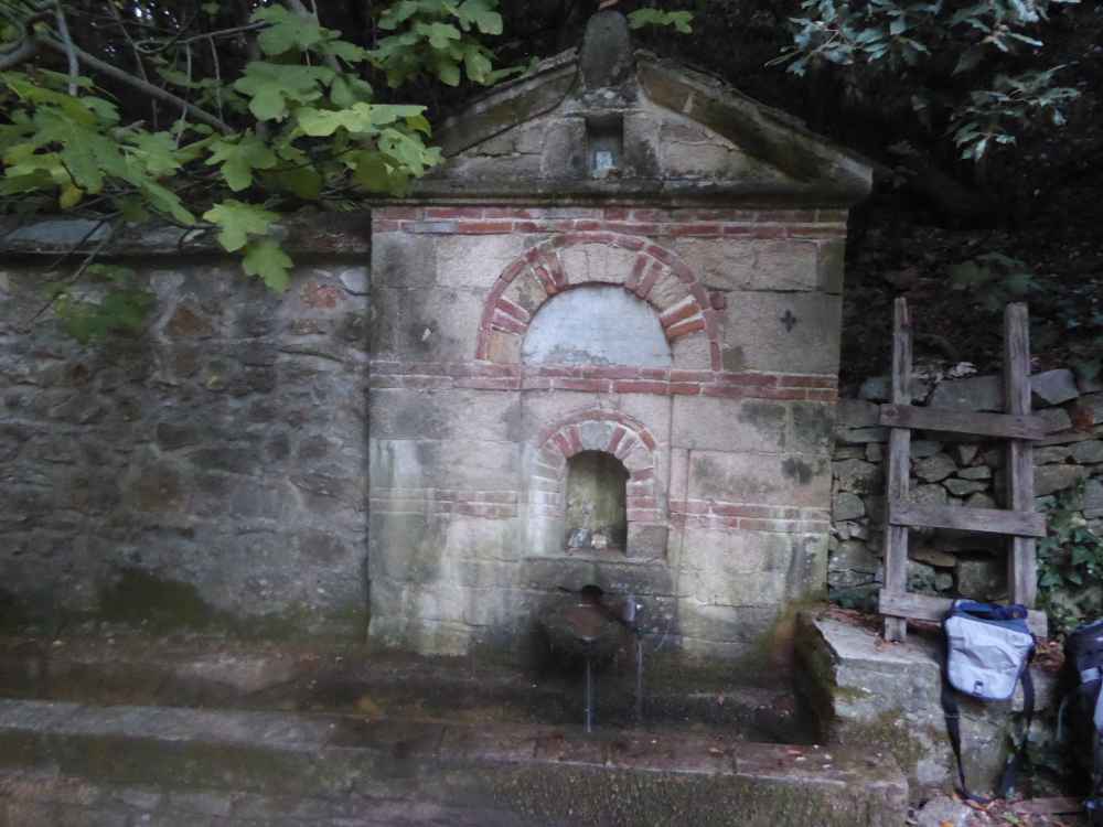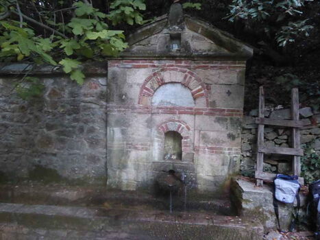 Wir kommen in einen Tannenwald und über eine Brücke und Serpentinen bergauf nach weiteren 15 Minuten zu der 2. Abzweigung links nach Agios Nilos, bzw. Kavsokalivia. Hier in der Nähe wohnt der rumänische Eremit Jannis. Wir gehen rechts weiter, durchqueren zuerst Macchia und dann einen Kastanienwald und erreichen eine Lichtung mit der Quelle Kria Nera, der zweiten Wasserstelle. Die Quelle Kria Nera hat das beste und kühlste Wasser auf dieser Etappe.