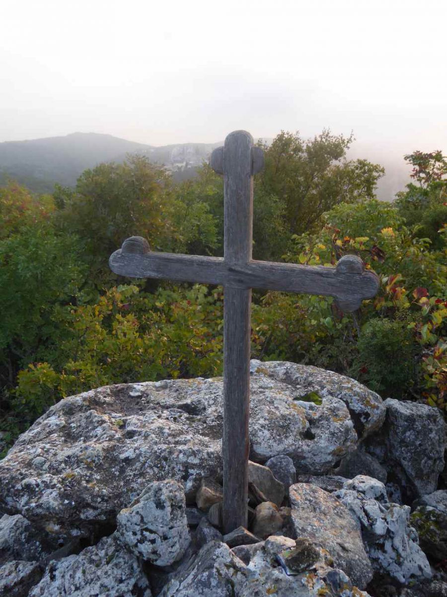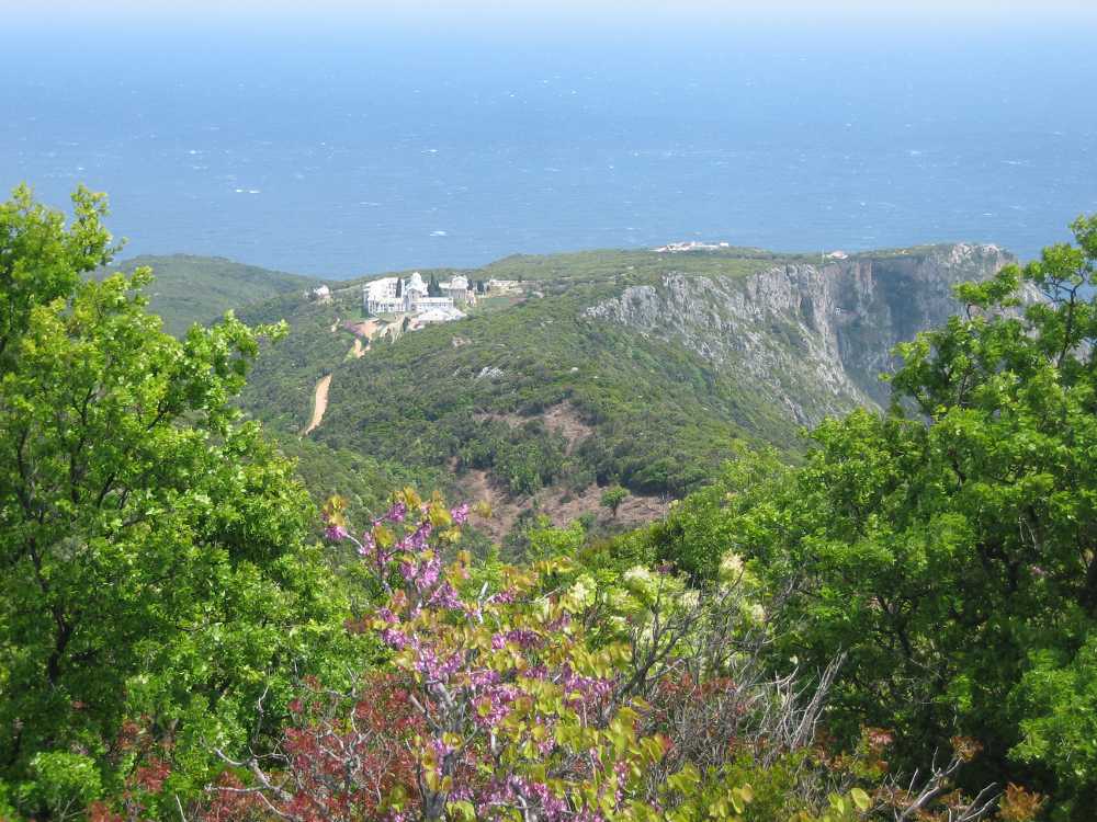 Wenige Meter danach kommen wir zu einem Holzkreuz, ca. 490 Meter hoch gelegen, von wo aus wir einen phantastischen Blick auf die rumänische Skite Timiou Prodromou und die Südspitze der Athoshalbinsel haben.